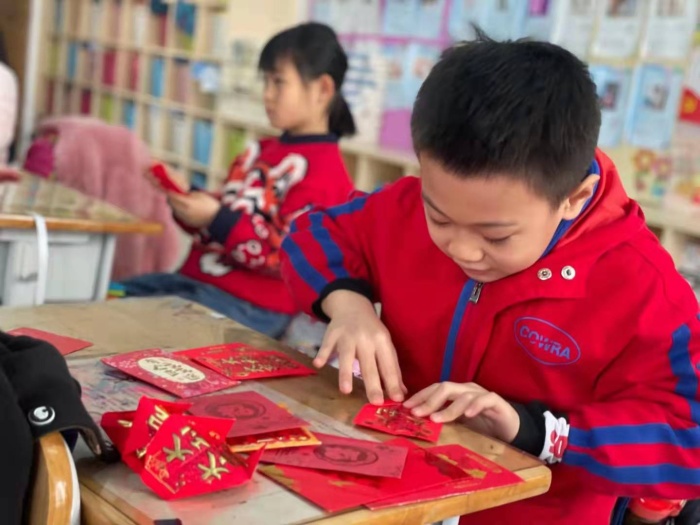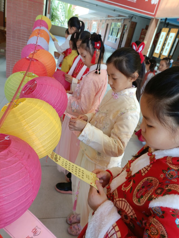 元宵佳節臨近,學生們在深入了解節日文化后,用利是封,制作一盞盞紅燈籠為學校披上了節日的盛裝。五彩的燈籠高高掛,教室內頓時成了一片燈的海洋。大家還興高采烈地參與到燈謎競猜游戲中,有的冥思苦想,有的駐足凝神,有的熱烈討論,有的雀躍歡呼,教室里一片其樂融融。