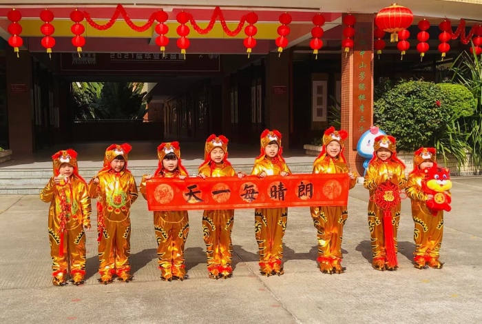 “咚咚鏘、咚咚鏘、咚咚鏘咚鏘咚鏘……來到朗晴小學校門口,便可以看到色彩艷麗的雄獅和活潑可愛的萌虎在歡快的鑼鼓聲中翻騰起舞,時而弓步站立、時而上身后仰、時而互相嬉鬧、時而變換隊形,盡顯朗晴學子陽光自信、熱情大方的風采,引起陣陣喝彩聲。