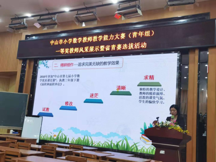 青年教師是學校發展的生力軍,是未來教育改革與發展的希望。為搭建小學數學教學教研交流平臺,進一步激發廣大青年教師更新教育理念和掌握現代教學方法的熱情,引領小學數學青年教師的專業發展,促進小學數學教師創新教學方法,優化教學過程,提升教學效率。9月30日上午,中山市小學數學教師能力大賽(青年組)一等獎風采展示暨省青賽選拔活動在中山市東區朗晴小學舉行。本次活動共分為兩部分:一等獎教師成長歷程風采展示和一等獎課堂教學比賽。