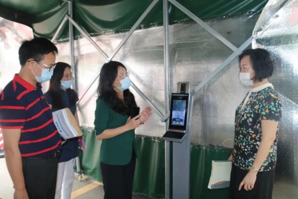 陳委員一行聽取了朗晴小學鄭鳳姚校長的詳細匯報,檢查組按照“高”、“準”、“深”、“實”的標準和要求,深入教室、飯堂、臨時健康觀察室、校醫室、臨時監測點等重點區域檢查防控措施落實情況,仔細核查學校疫情防控工作相關制度、疫情應急處置流程、防控知識宣傳、學生復課方案等資料,認真分析研判。各專家組對該校學生返校復學準備和疫情防控工作給予高度肯定并給出指導性意見。