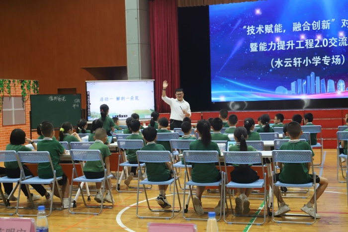 活動分為數(shù)字教材課例展示和“愛種子”課例展示兩個板塊。兩節(jié)課例同時進行,并在線上進行同步直播。軒小的拉手學校汕頭市西臚鎮(zhèn)尖山小學、惠州市龍門縣藍田瑤族鄉(xiāng)中心小學的老師,以及其他兄弟學校的老師一起收看了線上直播。