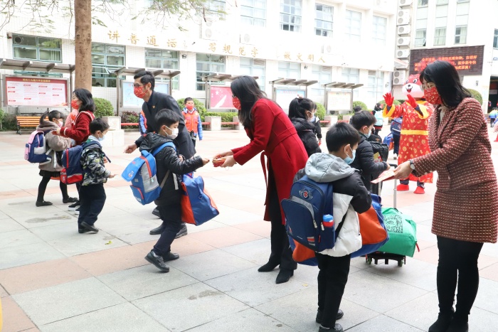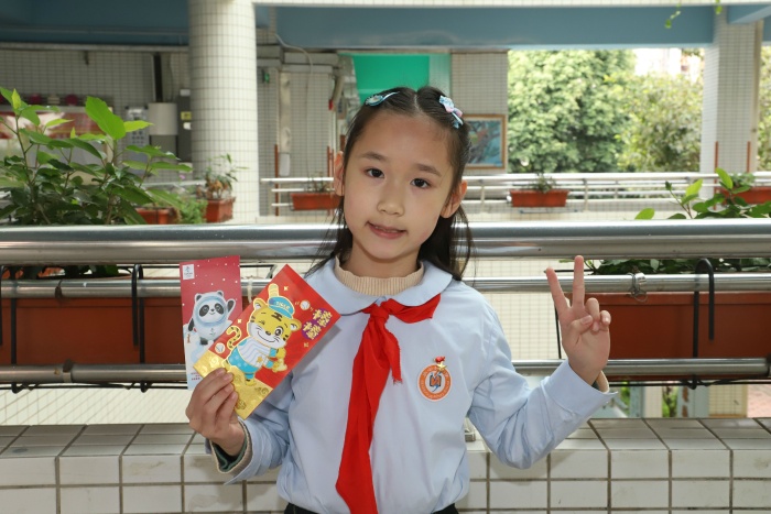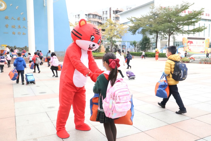 2月14日上午,東區(qū)水云軒小學(xué)到處充滿歡聲笑語。笑容可親的值日老師,和藹可敬的行政團隊站在校門口迎接軒小學(xué)子。他們給孩子們派發(fā)新年利是,一封封紅彤彤的利是在他們手中傳遞著,暖意濃濃。小小的利是里面是老師們精心準備的新春祝福書簽,上面畫有“冰墩墩”和“雪融融”,寄托著老師對學(xué)生的殷殷期盼,期待“一起向未來”。廣場上更有四名老師化身“四小虎”與學(xué)生熱情互動,給學(xué)生送上衷心的祝福。