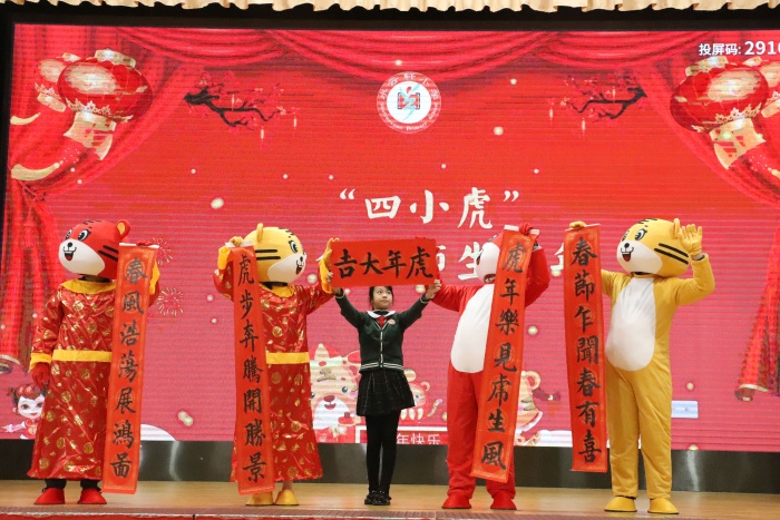全體師生參加2022年春季開學(xué)典禮。典禮開始,臺上率先走來了“吉祥虎”、“平安虎”、“健康虎”、“鴻運虎”,“四小虎”給大家送來新學(xué)期的祝福。