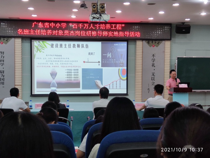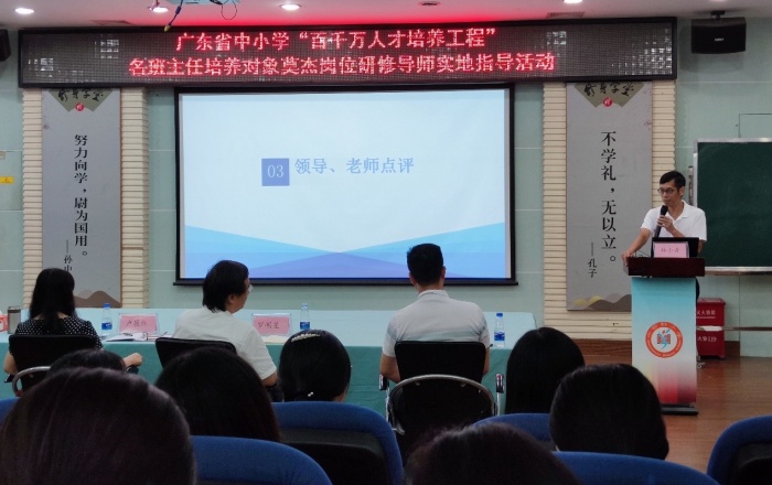 接著,黃文燦副校長匯報了學校在促進教師專業發展、提升班主任隊伍建設的具體做法,通過搭建“專家引領帶發展、師徒結對同成長、理論修養學習、教學實踐交流、教育教學研究、閱讀推動、外出交流學習、各項賽課、特色班集體的建設”等多種平臺,引領班主任實現“青年教師——新秀教師——骨干教師——名師”的梯度成長,全方位助推青年教師專業成長以及整個教師隊伍尤其是班主任的專業發展。