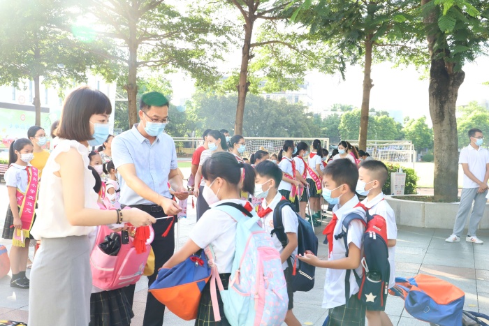 開學(xué)第一天,在校門口早早就有老師向?qū)W生們派發(fā)黨史小故事書簽。通過小小一個(gè)書簽,讓學(xué)生在迎接新學(xué)期的同時(shí),從百年黨史中獲取力量,煥發(fā)出勃勃生機(jī)。黨史小故事的書簽在老師和學(xué)生的手中傳遞,不僅是知識(shí)的傳承,更是歷史薪火和偉大中國(guó)夢(mèng)的傳承。校園內(nèi),大隊(duì)委化身志愿者正協(xié)助老師引導(dǎo)一年級(jí)新生熟悉校園環(huán)境。一聲聲親切的問候,一次次暖心的援手,軒小學(xué)子熱心助人的身影構(gòu)成一道美麗的風(fēng)景線。