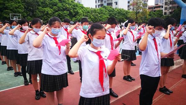 在儀式前,初二學生家長給孩子的寫了一封寄語青春希望的信,少先隊員在中隊輔導員的組織下,細細讀著父母充滿鼓勵的話語。一位家長寫道:現在,有父母為你遮風擋雨,有愛你的老師在左右攙扶;長大后,你將要面對人生旅途的坎坷,要懂得為理想而奮斗。在離隊儀式上,在二1中隊李楊澄的帶領下,全體2018級隊員唱響了嘹亮的隊歌。在師長的注目下,向著鮮紅的隊旗敬最后一個隊禮。這一禮,敬胸前的紅領巾,這一禮,敬一直陪伴左右的父母、師長;這一禮,敬不懈努力的自己。學校團委書記黃志創老師宣讀離隊人數,并向全體師生宣讀習近平總書記對廣大少年兒童的六一賀信,希望隊員們繼續刻苦學習知識,堅定理想信念,磨煉堅強意志,鍛煉強健體魄,爭取早日加入共青團組織,為實現中華民族偉大復興的中國夢時刻準備著。