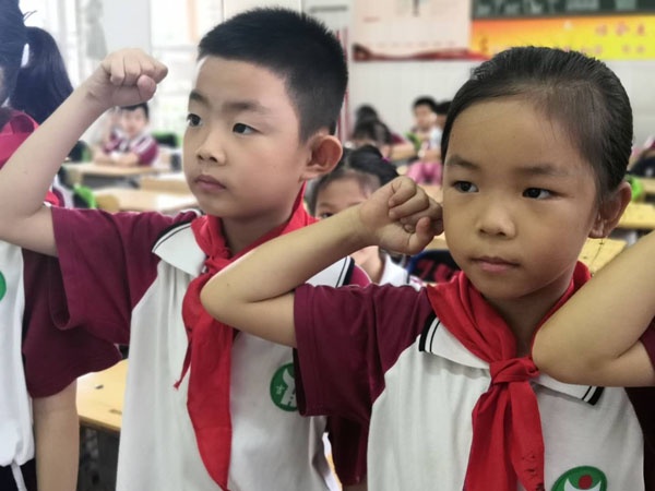 在入隊前期,學校大隊部開展了形式豐富的隊前教育,新隊員學習完成了“六知、六會、一做”的入隊基本標準等內容。認真觀看了全國少工委制作的少先隊組織教育微視頻《入隊第一課》;認真學習了隊章,知道了少先隊的隊名、創立者和領導者,知道了隊旗和隊徽的含義,知道少先隊員的標志和作風;認真學習了敬隊禮、戴紅領巾、唱隊歌等基本技能。通過對隊章的學習,入隊前要為大家做一件好事,在家長的協助下,有的走進社區去清理綠化帶里的垃圾,有的主動承擔力所能及的家務勞動,孩子們從自己做起,從身邊的小事做起,用自己的實際行動,為紅領巾增光添彩。