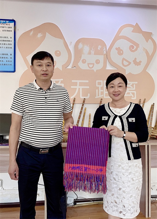 29日上午,學(xué)校的大課間活動,第十一小600多名學(xué)生們展示代表辦學(xué)特色、具有民族風(fēng)情的竹筒舞,展示了獨(dú)特的貴州民族文化,學(xué)生們的表演十分精彩。接著是到學(xué)校手工室的參觀活動。鄧海校長親自展示織布機(jī)的使用方法,最后還送給雍景園小學(xué)織好的繡有“六枝特區(qū)第十一小學(xué)”字樣的手工成品留作紀(jì)念。