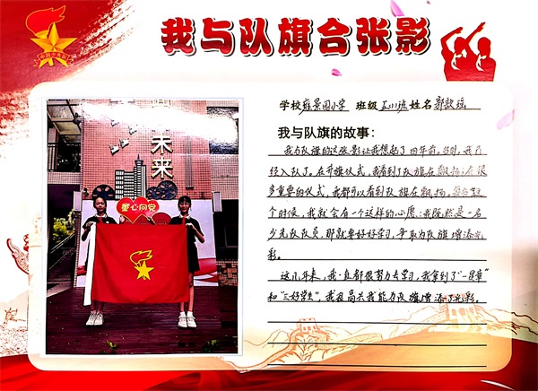 六月中旬,學校開展了“我和黨旗合張影”、“我與隊旗合張影”活動。隊員們還把自己與隊旗或“手持式”隊旗相框的合影做成了“合影記錄卡”,把自己與隊旗的小故事記錄下來。一個個小故事,表達了隊員們成為一名少先隊員的光榮與喜悅之情;表達了隊員們聽黨話、跟黨走的決心。