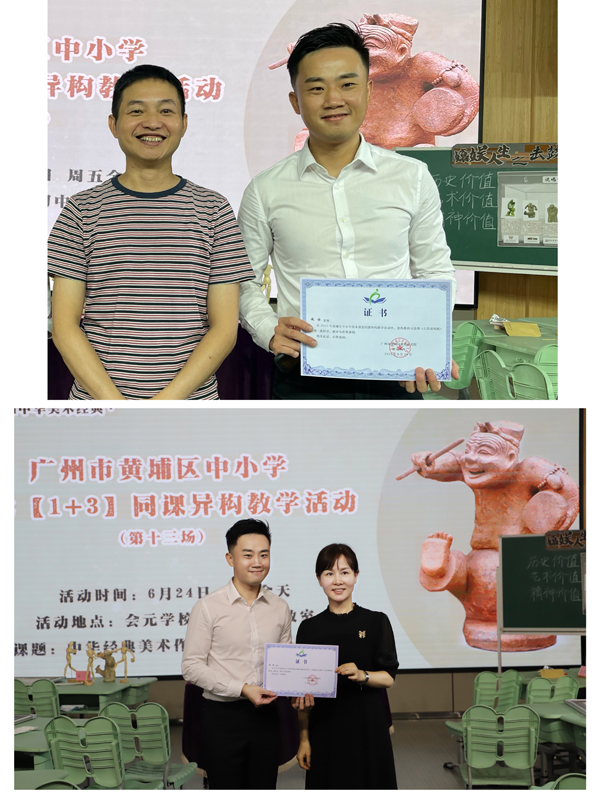 2022年6月24日,《中華美術經典鑒賞》“骨干帶新秀”同課異構教學比賽活動(第十三場)在廣州市黃埔區會元學校順利舉行。中山市東區中學施恒老師受邀代表中山骨干教師與廣州黃埔區三位優秀教師同課異構并進行教研交流。本次活動由黃埔區中小學美術教研員、區教研會會長高旦老師組織開展,廣東省美術教研員鐘國榮老師、中山市東區街道藝術專干趙海賓老師、中山市小欖鎮傳統文化中心組郝同超老師與黃埔區中小學美術教師代表到場觀摩。活動采取線上回播、線下相結合的形式開展,為無法到場的老師們提供了有效觀課渠道。