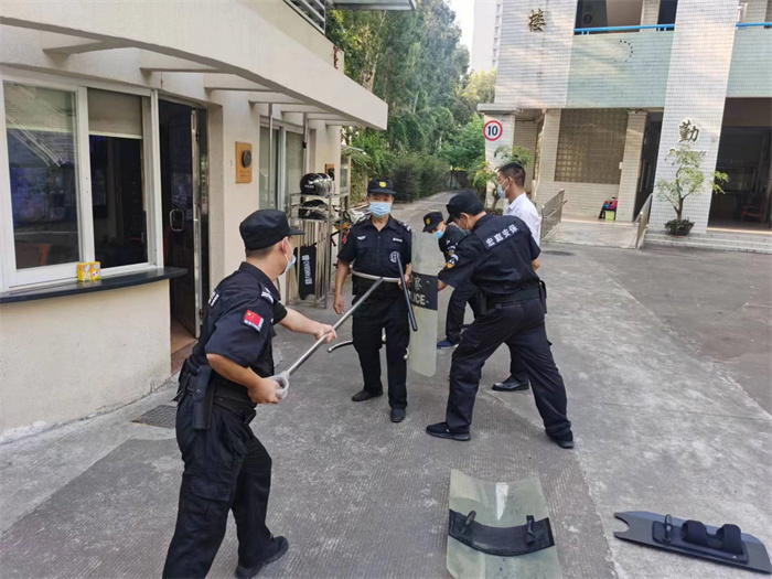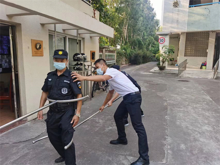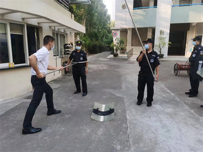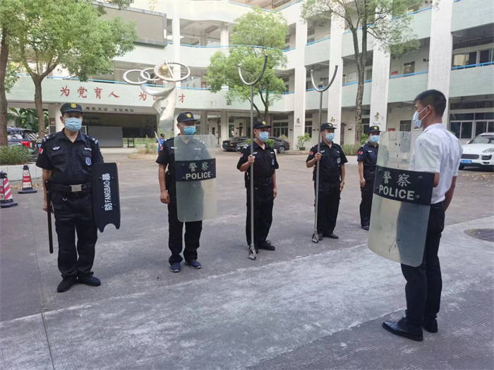 “遇到緊急情況,要使用好手中的器械,在保護好自己、保護好周圍師生前提下,與歹徒形成對峙。爭取時間,及時報警,配合公安機關共同制服歹徒。”演練現(xiàn)場,物業(yè)公司吳敏聰經(jīng)理為大家介紹了最小應急單元培訓要求,講解了盾牌、鋼叉、應急棍、抓捕器等器械的特點、用途及應對突發(fā)事件的措施。培訓完后,學校對全體保安進行了突發(fā)事件應急處置模擬演練。當保安人員發(fā)現(xiàn)可疑人員持械欲闖入校園,最小應急單元馬上增援,快速操起盾牌,拿出鋼叉,將“歹徒”制服住。