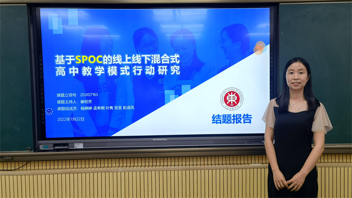 謝柏芳校長主持的課題《基于SPOC的線上線下混合式高中教學模式行動研究》以后疫情時代較為流行的線上線下混合式教學為研究主題,結合最新的SPOC理念,探索在高中日常教學中開展適合校情的分層不分班的混合式教學模式。該課題由課題組成員楊婷婷老師代表匯報。楊老師在匯報中著重介紹了課題的研究過程和研究結果。從前期的師生調查到兩輪教學實踐對模式的修正調整,再到最后形成模式,楊老師對課題組的研究過程做了詳細的展示。經過兩年的研究,該課題組發表了論文4篇,獲獎7篇,沉淀了三本校本教材、教學資源庫和學生的個性化學習檔案袋等大量的一手資料,并多次走出去引進來交流推廣,取得了一定的成效。