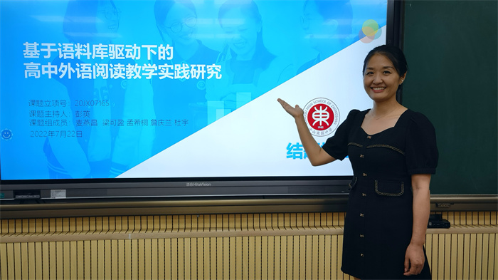 彭英老師對課題《基于語料庫驅動下的高中外語閱讀教學實踐研究》進行陳述。她指出課題的研究結果表明,語料庫信息技術支持下的外語閱讀教學有利于培養學生閱讀微技能、提升閱讀素養、分析性思維能力和自主閱讀能力。并促進學生的自主探究能力、小組合作能力和英語學習效果。同時也展示了在全體課題組成員的努力下課題組研究的殷實成果。最后,彭老師還對課題研究中出現了問題進行了反思和展望,并提出了基于課題支撐基礎與深度研究的新的課題研究的思考。緊接著課題組成員孟希桐老師向全體專家評委做了課題成果和校本資源電子材料的展示。