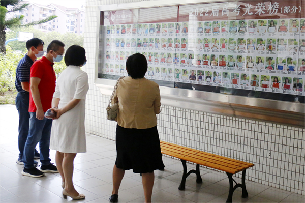 走到折桂路上,馮副主席指出,桂花樹下的條木椅和四墩上刻著的詩詞這一設計非常好,讓同學們在休憩的閑暇,也可以有意無意地欣賞中國古詩詞,浸潤中國優秀傳統文化。當聽到謝柏芳校長介紹折桂路的來歷,以及謝校長會在折桂路上為優秀的同學拍照紀念的時候,馮副主席更加肯定學校這種非常用心用情做教育的做法和情懷。