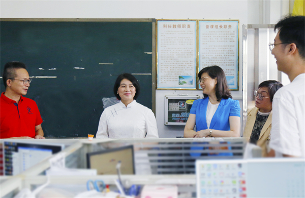 隨后,馮金怡副主席一行走進教師辦公室,看望慰問正在備課的一線教師們。“祝老師們教師節、中秋節快樂,感謝你們對教育事業的付出和貢獻!”看到一個個充滿青春朝氣的老師,馮副主席坦言自己一下子回到了當年從教的時光,雖然工作有變動,但自己對教育始終念念不忘,始終關注教育,傾情教育,雖然自己不在教育崗位上,但在工作中愈發感受到教育的重要、教師的偉大。走訪中,市、局領導與教師們親切交談,聆聽教師心聲,送上市委、市政府的關懷與問候。