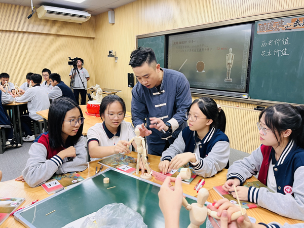 “咚…咚咚…咚咚咚”,施恒老師以鼓奏樂,以家鄉閩南非遺文化說唱片段導入課堂,并運用多元式對話場景開展教學活動,通過“魔法”技術的設疑,引導學生跟隨線索識別擊鼓說唱俑獨特的面部特征,通過人偶關節定點的擺動,學生化身工匠人,感受不同姿態動作帶來的傳神趣味體驗。課堂的最后,施恒老師以說明介紹文字標簽為導引,牽引學生用精簡的文字了解不同姿態的說唱俑形象并準確識別擺放說唱俑正確位置,通過本節課,讓學生感受漢代說唱藝人的樂天與自由。