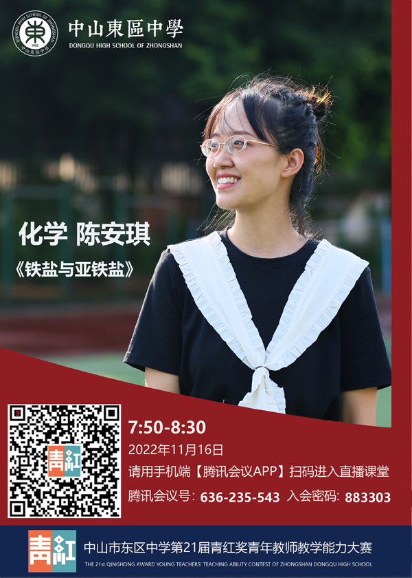 為了探索青年教師專業發展的有效路徑,培養新生力量,我校定于2022年11月16日(星期三)上午舉行中山市東區中學第21屆“青紅獎”青年教師教學能力大賽活動,給青年教師搭建展示自我和交流學習的平臺,以提高青年教師的教育教學水平,促進學校的可持續性發展。