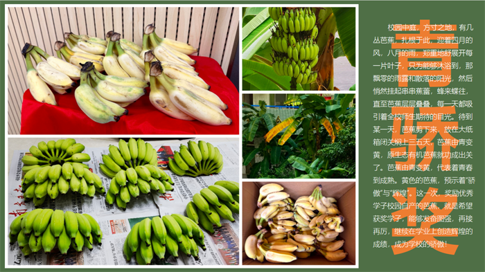 在剛剛結束的高一全市適應性統考和高二段考中,我校學子積極進取,勇攀高峰,涌現出了一大批表現突出的同學。這充分證明只要愿意堅持與努力,所有的付出終究結成累累碩果!恰逢我校果實豐收,芭蕉由青變黃,代表著青春到成熟,黃色的芭蕉,預示著“驕傲”與“輝煌”。學校為卓越學子們送上豐收的果實——香蕉,寓意獲獎學子在學業上創造輝煌的成績,成為學校的驕傲!
