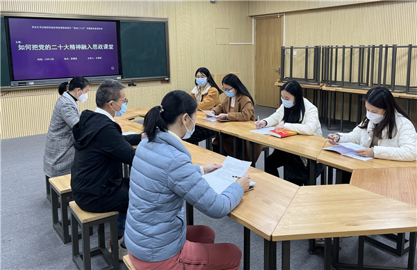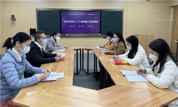 率先發言的是符曉老師。她從課程設計思路、二十大相關知識融入、課堂效果和教學反思四個方面對《從黨的二十大看基層群眾自治》一課進行備課分享。她認為,思想政治理論課是落實立德樹人根本任務的關鍵課程,將黨的二十大精神融入思政課教學,要創新教學方法,讓學生愿意聽、聽得懂,入腦入心。倪茵珠老師從教學準備,教學過程以及教學小結三個方面對《感悟黨的二十大報告中的哲學智慧》一課進行備課分享。她說到,學習貫徹黨的二十大精神是新時代思政課教師理應承擔的時代重任,思政課教師備課時可以充分利用新華網等官媒資源,把知識講深講透講有趣??平M其他老師也就如何將二十大精神融入思政課教學紛紛發表看法。其他老師也都就如何把黨的二十大精神融入思政課堂談了自己的認識。