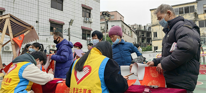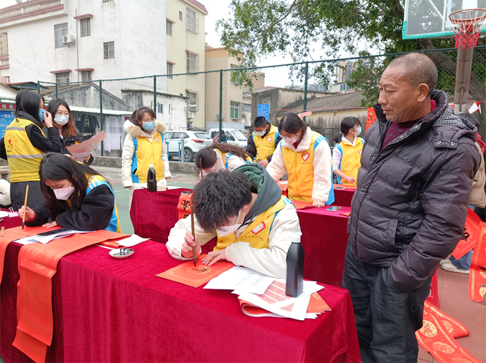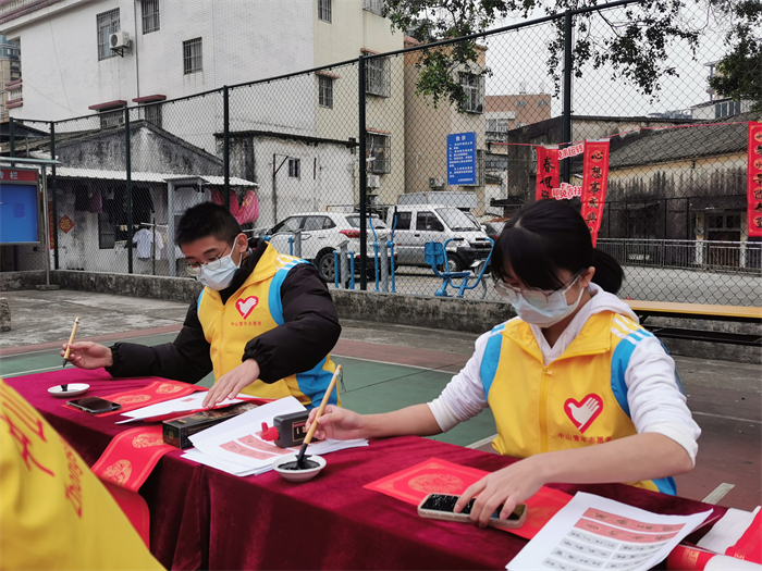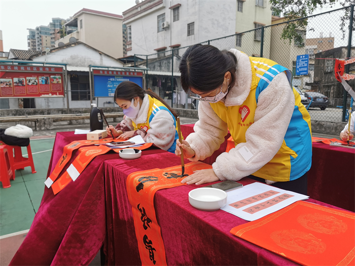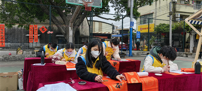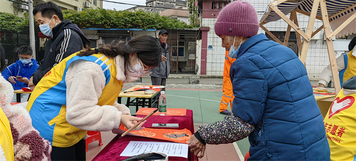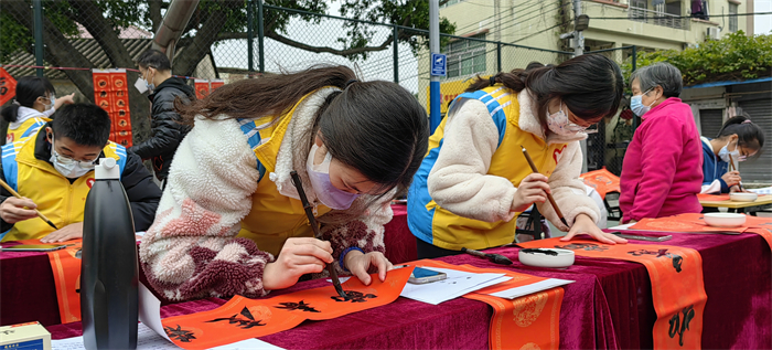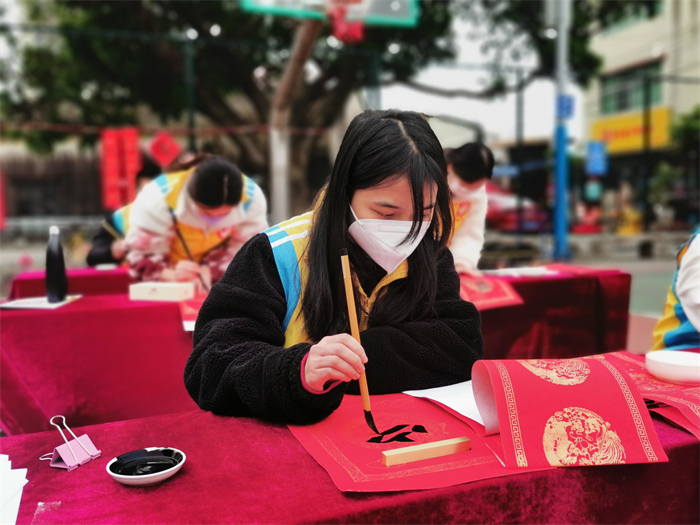 天氣雖然濕冷,但是現場卻是暖意涌動的。紅紅的春聯、濃濃的祝福、一張張開心的笑臉繪成了一幅幅喜慶祥和的畫面。這次“青春情暖,揮春到家”志愿服務活動不僅豐富了學生的生活,也讓學生在活動中鍛煉了現場創作書法的心態,更為社區居民送去了新年的祝福,為喜迎傳統佳節營造了濃郁的節日氛圍。