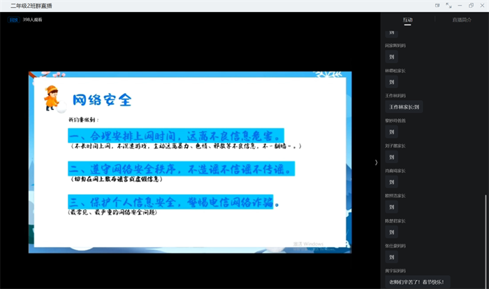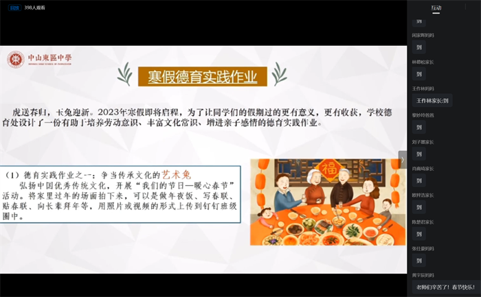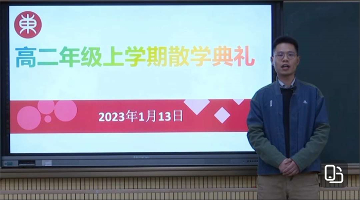 寒冬料峭期末至,碩果滿懷假期來。伴隨著歲月匆匆的腳步,承載著勤奮耕耘的喜悅,圓滿結束了一學期緊張而又充實的學習生活。我們迎來了期盼已久的寒假,為了給這個特殊而又充實的學期畫上圓滿的句號,更好地引導學生安全、充實、有意義地度過寒假生活。1月13日晚上,東區中學高二全體師生相聚釘釘家長群,舉行了2022-2023學年上學期線上散學典禮,本次散學禮由高二年級錢逢勝主任主持。