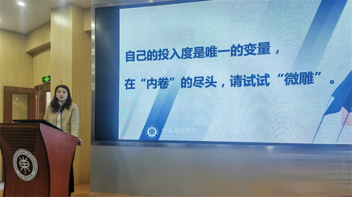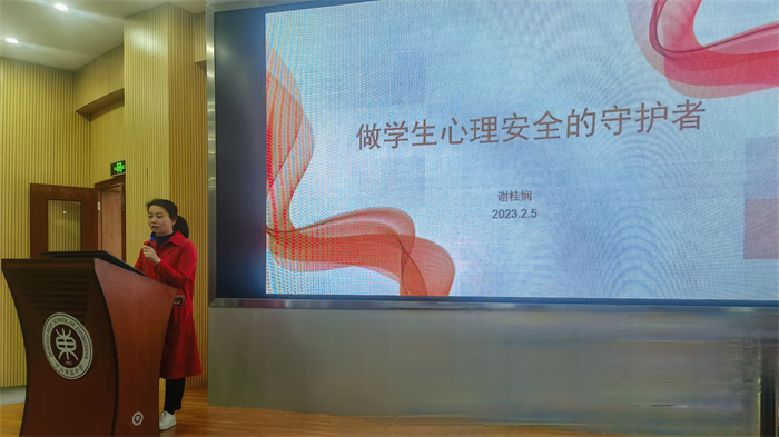 謝桂嫻老師就本學期心理工作進行了分享,她倡議班主任老師們要做好學生的守護者,保持對學生的密切關注,給予他們心理上和學業上的關懷,建立良好的家校關系、師生關系。