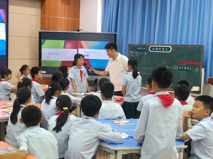 第二節李建主任執教五年級的《分數的再認識》,李主任從“數數”引入計數單位,同時通過具體情境,讓學生對1的認知從自然數1拓展到單位“1”,進一步構建關于“率”的分數的認識,并且對“量”和“率”兩者進行辨析,形成完整的分數認識。整堂課沉穩幽默,聽課老師贊不絕口。