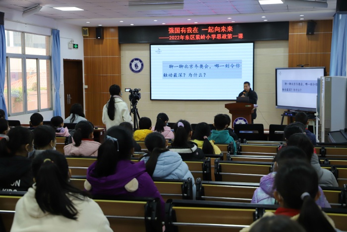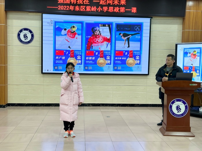何書記以“強國有我在 一起向未來”為主題,用生動的語言和激昂的情感,分享了蘇翊鳴、谷愛凌等奧運健兒頑強拼搏、為國爭光的故事。何書記說,賽場上高光時刻的背后是運動員們日復一日的努力和拼搏,勝利與失敗是并存的,但是運動健兒從不言敗,不斷超越自我,不斷突破極限,他們身上體現的奧林匹克精神,給大家帶來激勵的力量。紫小學子紛紛表示何書記的“思政第一課”精彩紛呈,爭先恐后地在課堂上主動分享了自己對冬奧會的感受。雷悅然同學說:“我對北京冬奧會中的首金印象最深,中國短道速滑的隊員們團結協作、奮勇向前、分秒必爭,不到最后一刻都不放棄,最后以零點幾秒的優勢沖過終點,贏得了比賽。那一刻我被他們的精神所感動。”王煜均同學則分享了谷愛凌在大跳臺中的比賽場面,谷愛凌在前兩跳與第一名有差距時,勇于挑戰自己,在第三跳向最高難度挑戰,這種突破極限的體育精神讓我印象深刻。