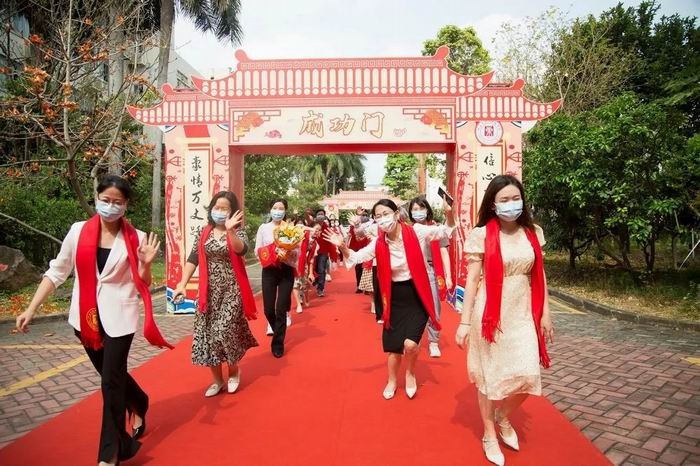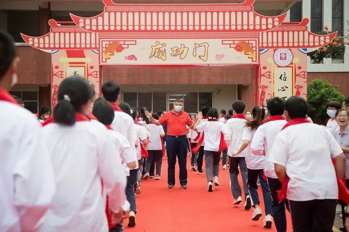 下午兩點四十分,高三學子整肅在學校廣場,分班依次穿過“成人門”,走上紅地毯。全體高三老師列隊兩側,雙手為剛剛跨過成人門檻的學子們披上紅色圍巾,歡送他們穿越“成功門”,登上“十八歲成人禮暨高考動員大會”的主會場。