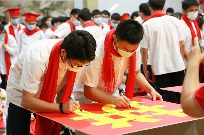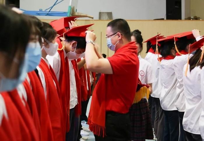 周錦泉校長,張旭副校長帶領班主任為學生佩戴成人帽、頒發《中華人民共和國憲法》讀本。成人是一種超越生命時間尺度的責任與擔當。頭戴成人帽,手捧《憲法》,這一刻他們已是肩負責任與使命的成人了,寓意著同學們要以共和國公民的身份去承擔起法律賦予的權利和義務!同學們要用一往無前的勇氣去面對高考,面對未來的人生。