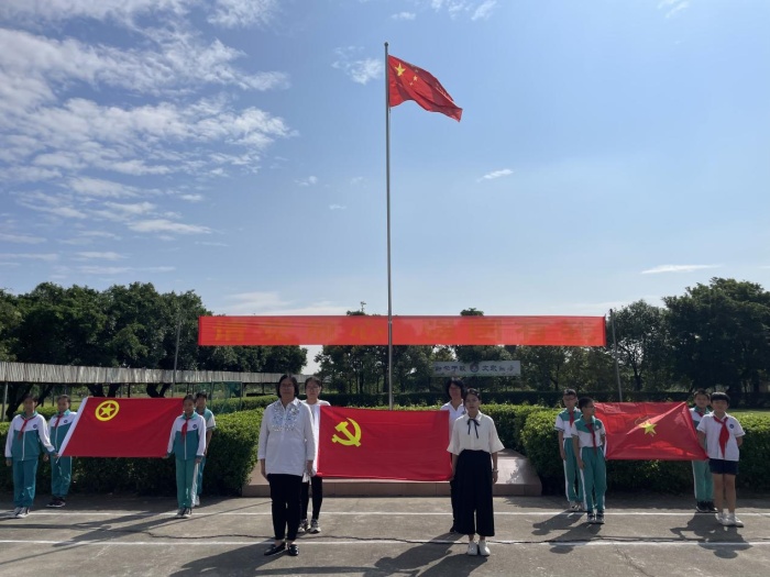 少先隊員們在黨支部書記詹前秒校長和少先隊大隊輔導員林素涵老師的帶領下,在隊旗下高舉右拳,莊嚴宣誓,鏗鏘的誓言表達了他們在黨的陽光沐浴下在星星火炬的照耀下,從小聽黨話、跟黨走的堅定信心和決心。
