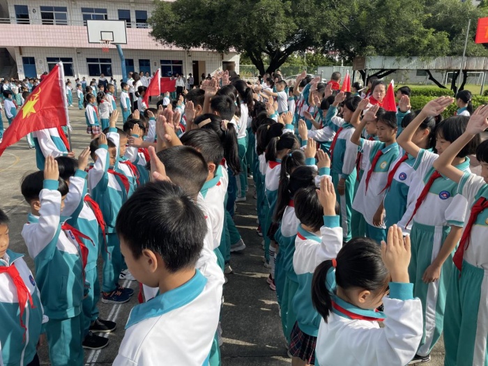 最后在學校少先隊大隊輔導員林素涵老師的帶領下,全體師生進行莊嚴呼號后,阜沙鎮豐聯小學少先隊建隊72周年主題活動暨新隊員入隊儀式活動在激昂的退旗曲中圓滿落下帷幕。