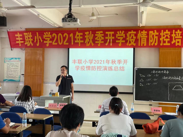 8月29日上午,中山市阜沙鎮豐聯小學開展2021年秋季開學疫情防控知識培訓及應急演練,阜沙醫院冼麗堅護士培訓學校全體老師七步洗手法及消毒水使用方法,演練分設入校測溫、校醫問診、課中學生健康異常處理、配餐流程、封閉封控措施啟動五個場景進行演練。演練后,豐聯小學衛生副校長阜沙醫院急診科張春貴主任和豐聯小學詹前秒校長分別對各個場景進行點評和小結、同時對存在的問題提出詳細的整改意見。