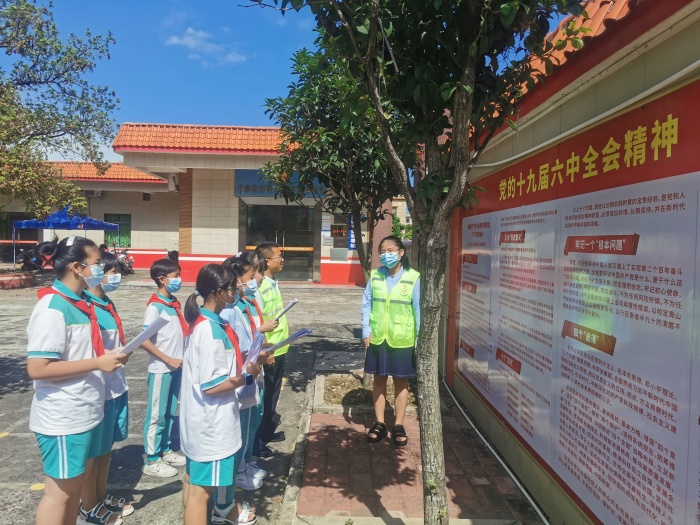 7月8日,阜沙鎮豐聯村府接到熱心群眾吳丹壕的點單,希望學校老師在假期期間可以為轄區內的青少年開展新時代文明實踐支教助學志愿活動,培養學生踐行主流價值,爭做新時代新少年。接到點單后,阜沙鎮志愿服務青年突擊隊助學支教分隊第一時間組織志愿者與豐聯小學教師利用假期期間,為學生開展主題為“弘揚紅色文化·傳承紅色基因”的愛國教育活動。活動中,豐聯小學教師與流動兒童來到豐聯村府大院,黨員教師植耀瑩對學生進行黨史宣講,學生邊聽邊記,充分發揮紅色文化資源和教育基地功能,利用歷史素材和現實教材,加強對學生的愛國主義教育,讓紅色基因融入青少年兒童日常學習、生活和社會實踐之中。