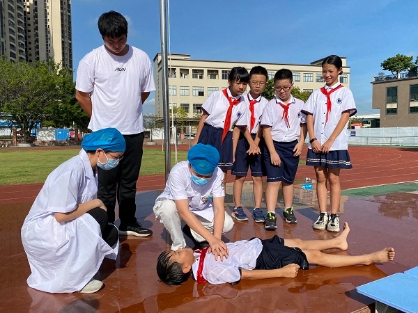 活動(dòng)首先模擬兒童溺水場(chǎng)景:幾位同學(xué)來(lái)到水池邊,一同學(xué)失足落水,同伴討論如何施救,后一致決定呼叫成人施救,教師扮演施救人員,抵達(dá)現(xiàn)場(chǎng)后,進(jìn)行緊急施救,全體學(xué)生觀摩施救人員如何操作,現(xiàn)場(chǎng)同步配有詳細(xì)講解。觀摩了落水、施救過(guò)程以及傾聽(tīng)講解內(nèi)容后,同學(xué)們對(duì)正確救助方式及注意事項(xiàng)更加了然于心。接著被救的落水同學(xué)平躺在地上,阜沙醫(yī)院醫(yī)務(wù)演習(xí)人員入場(chǎng),邊講解邊做心肺復(fù)蘇展示。