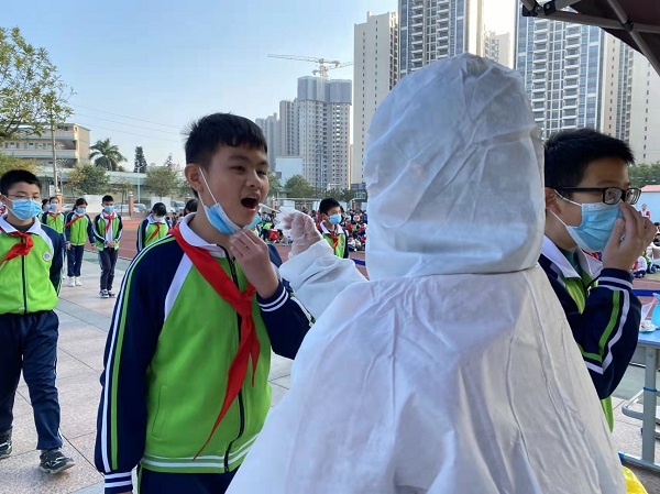 本次演練模擬校園出現陽性病例處置流程。演練前,羅松小學疫情防控領導小組制定了詳實的演練預案,演練環節的各項舉措和人員分工具體到位,同時特別對容易疏忽的細節做了預設和安排。演練開始,疾控部門致電羅松小學梁柱明校長,報告羅松小學某同學核酸檢測陽性,并要求排查該生信息。隨后由羅松小學疫情報告人李濤主任排查學生信息,梁柱明校長召集疫情防控專班組成員開會,啟動應急預案。安全后勤組成員就位,拉起警戒線,嚴控校園人員進出;醫療保障組安排校醫和班主任做好防護,轉運該生到相應隔離室,消毒組全程跟蹤消毒;班主任致電家長,要求到校配合疾控部門開展工作,校醫進行流行病學調查;校長向上級部門匯報當前應急舉措,醫療保障組在疾控部門指導下開展校園場室消毒,同時組織全校師生進行核酸檢測。各環節環環相扣,有條不紊。