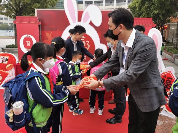 春風十里,不如校園有你。2月6日上午,懷著對新學期的美好期待,羅松小學學子開心步入闊別兩個月的美麗校園。為更好迎接同學們歸來,學校開展了以“感受傳統文化,喜迎癸卯兔年”為主題的歡迎儀式,儀式設計兔年主題展臺,展臺兩邊是雙兔拜年,中間放置充滿粵式諧音祝福的果蔬禮品,寓意聰明、勤懇、平安等,寄托對同學們的深深祝福,同時安排六位舞獅少年,頭頂獅子,分置走道兩側,醒獅開門,為同學們鼓舞斗志。學校還用心為每位同學準備了一份寫滿新春寄語的特殊紅包,包含著羅松小學老師們的一份份殷切祝福和期望,激勵同學們以昂揚斗志,滿懷激情投入到新學期的學習中去。