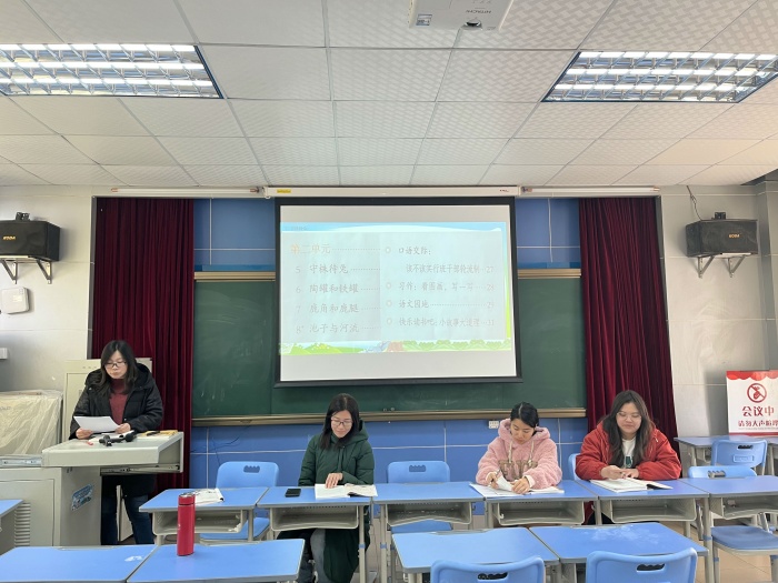 首先由三年語(yǔ)文備課組的梁杰揚(yáng)老師進(jìn)行統(tǒng)編小學(xué)語(yǔ)文教材三年級(jí)上冊(cè)第二單元的整體解讀。她從教材基本架構(gòu)、單元體系、選文特點(diǎn)和教學(xué)建議幾方面進(jìn)行全面系統(tǒng)的分析,明確單元各板塊的定位和功能,把握單元各板塊之間的內(nèi)在聯(lián)系,并與全冊(cè)教材做一個(gè)縱向梳理,把握全冊(cè)教材中各語(yǔ)文要素螺旋上升的縱向聯(lián)系。然后由王喬林老師針對(duì)單元目標(biāo)的整體把握、語(yǔ)文要素的有效落實(shí)以及課文重難點(diǎn)的突破進(jìn)行分析和闡述。