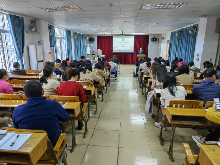 會議伊始,梁柱明校長向全體教師致以新春的問候和美好的祝福。接著,梁校長對2022年學校工作進行了回顧。他從德育工作、安全衛生、教育教學等方面總結了學校取得的成績,肯定了廣大教師兢兢業業培根鑄魂的工作態度,并提出了新學期的新要求和更高的發展目標,為新學期學校各項工作指明了方向,努力提升教育高質量發展。
