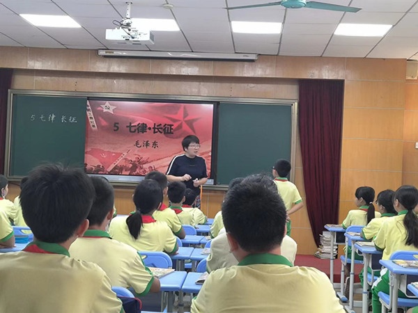 首先是課例展示,語文科組分低中高三個年級科組分別進行課例展示。低年級組由梁萍老師進行《樹之歌》的授課。在教學過程中,梁萍老師通過創設情境,加上精美的插圖,讓學生自主探究、自主識字。梁萍老師通過形式多樣的讀、游戲、練習,使課堂氣氛活躍,學生積極投入,走進文本,提煉文中的知識,充分發揮學生學習的主體性。中年級科組則是由肖曉娟老師展示了課例《一個豆莢里的五粒豆》,文章通過豐富的想象,幻想和夸張的手法,充分表現了童話的特點。肖老師帶領同學們從圖片欣賞導入入手,讓學生了解安徒生童話的精彩之處,引入童話故事的學習,接著在學生充分預習的基礎上,讓學生抓住文章的重點部分進行學習理解故事內容,在學習過程中,不僅理解了課文,還突破了課文教學的重難點,老師潤物無聲,學生滋潤有露。高年級組則是王穎芳主任執教的課例《七律·長征》,讓六(4)班的孩子和聽課的老師深深地體會到革命的艱辛和紅軍的英雄氣概。王老師這一課目標清晰,內容豐富,語言精煉。她不僅善于把控課堂,落實教學目標,而且注重啟發引導,激發學生積極思考,更妙的是,在理解詞語的時候,更是從朗讀、從字形、從畫面多方面進行,讓學生真真切切地理解了詞語。王老師的課堂氣氛熱烈,她用激昂的語言,不僅讓學生體會到文章語言的高超,也讓學生通過感受語言的魅力,深深地被紅軍那種大無畏的英雄氣概所震撼。在課堂中,不斷穿插補充相關的歷史知識,提升了學生的思維品質和思想文化修養,充分發揮語文課程育人功能。
