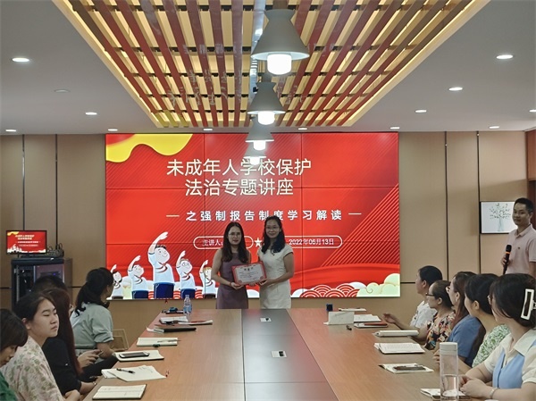 為了更好地明確教師保護未成年人的責任和義務,進一步推動《中華人民共和國未成年人保護法》和侵害未成年人案件強制報告制度的落實,保障未成年人身心健康成長,6月13日,中山市實驗小學教育集團大豐小學邀請了廣東省國融律師事務所的唐麗斌律師到校開展了“未成年人學校保護法治專題之強制報告制度學習解讀”講座,全校教師都參加了此次講座。
