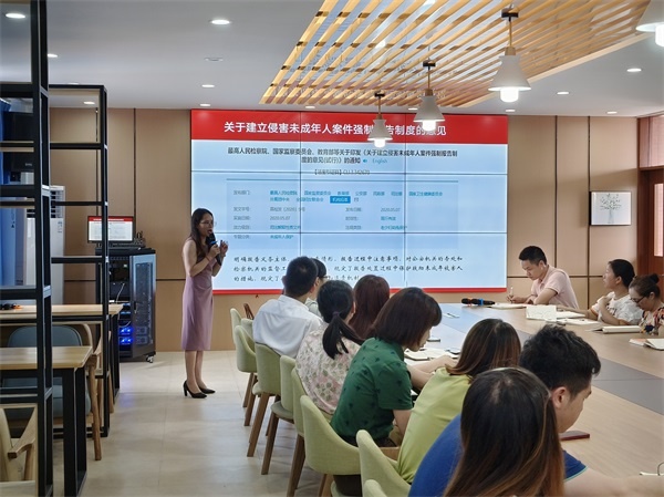首先,唐麗斌律師從“涉及強制報告的相關法律法規”、“九部制定強制報告制度意見的背景及意義”、“強制報告制度的具體要求及落實建議”三大方面進行闡述,以《中華人民共和國未成年人保護法》、《中華人民共和國預防未成年人犯罪法》和《關于建立侵害未成年人案件強制報告制度的意見(試行)》的有關規定為基礎, 結合強制報告制度的形成,講解了什么是強制報告制度、強制報告的意義、誰有報告義務、有哪些情形是需要報告的,特別詳細解讀了在工作中發現未成年人遭受或疑似遭受不法侵害以及面臨不法侵害危險的九種情況,應當立即向公安機關報案或舉報,及時發現、處置侵害未成年人犯罪。隨后,結合其他學校發生的相關案例,唐律師提醒廣大教職員工增強職責意識,在教學過程中,要多多關注未成年的身心情況,如果發現異常,要最大限度地保護未成年人。