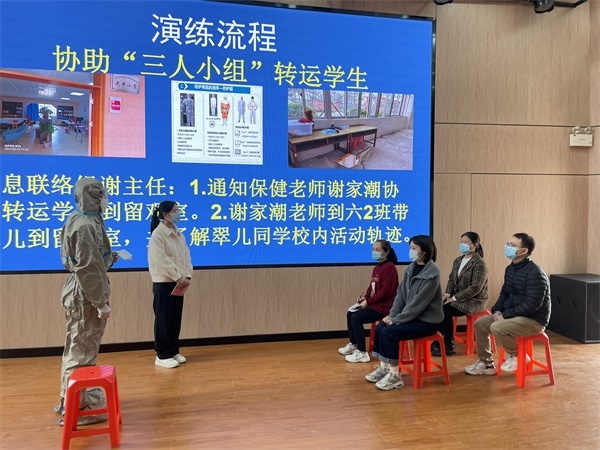 模擬情景為某日學生上課期間,黃艷冰校長接到衛生健康部門電話通知學校有新冠肺炎病例的密切接觸者后,立刻聯系信息聯絡組謝振森主任確認學生信息。隨后學校立即啟動新冠肺炎疫情防控處置應急預案,迅速應對疫情防控緊急情況。從學校啟動應急響應到各疫情防控工作小組迅速開展相應工作,從隔離學生到聯系家長開展流行病學詢問,每一步都快速有序、細致認真。
