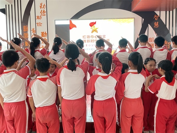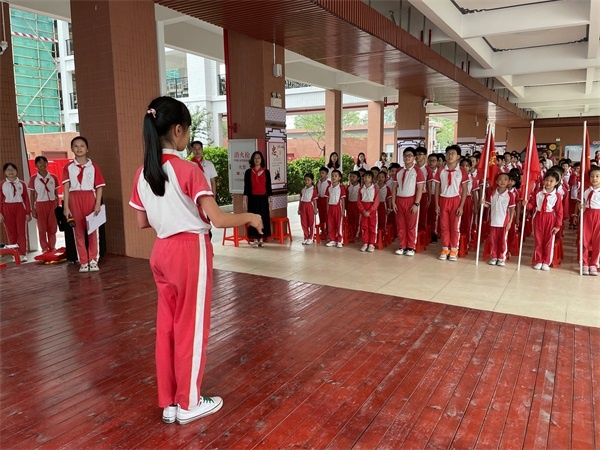 隨后,六年級的老隊員們為二年級新隊員佩戴鮮艷的紅領巾,并互相敬隊禮,他們個個精神飽滿,臉上洋溢著自豪的笑容。在這一敬一回中,少先隊的精神被傳承下去,做到了“星星火炬,代代相傳”。在學校少工委副主任梁耀昌的帶領下,新老隊員在隊旗下莊嚴宣誓,整齊響亮的誓詞在大豐小學的校園上空回蕩著。
