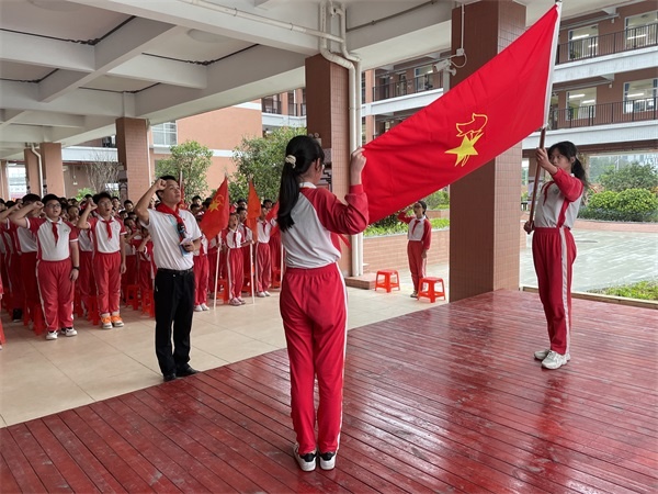 隨后,學校少先隊大隊長蘇翠兒同學上臺發言,她對新隊員們的加入表示衷心祝賀,同時希望少先隊員們都能夠在星星火炬的指引下,好好學習、好好鍛煉,用自己的實際行動為胸前的紅領巾增添光彩。在活動的尾聲,新老隊員們自豪地挺起胸膛、緊握拳頭,跟著張婉老師進行呼號,儀式最后,全體隊員敬禮,大隊旗手手握隊旗退場,本次少先隊入隊儀式圓滿結束。