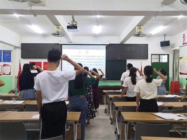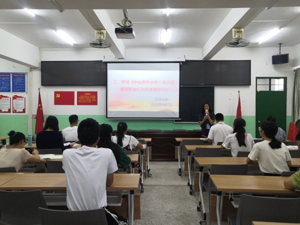 9月7日下午,2020年師德建設主題教育月啟動儀式在學校多媒體室舉行,全體教師參加了本次活動,活動由校長蘇少麗主持。在師德建設主題教育月啟動儀式上,蘇少麗校長傳達了《中山市教育和體育局關于開展2020年師德建設主題教育月活動的通知》的內容,蘇校長對全體教師寄予厚望,希望全體教師堅持做到潛心問道、潛心育人,勉勵大家為人師表要高標準嚴要求,使得師德建設從外在約束成為一種內在行動,進而轉化為教師個人的修行。隨后,全體教師還學習了《中山市中小學(幼兒園)教師職業行為負面清單(試行)》,簽訂了師德承諾書。在蘇少麗校長的帶領下,教師們還重溫了教師誓詞,錚錚誓言表達了老師們踐行師德承諾的堅定決心。