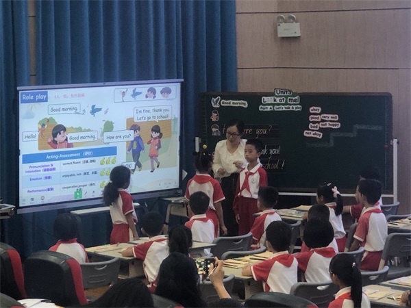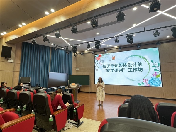 課堂展示結束后,中山市實驗小學教育集團大豐小學英語科組長陳秋霞老師對人教版英語三年級上冊Unit3 Look at me!進行單元整體教材解讀。她從整體確定單元課時劃分、整體確定單元大小主題、整體設計單元教學目標、整體設計單元學習活動、持續開展課堂教學評價等方面進行論述,強調要圍繞英語學習活動觀的“學習理解、應用實踐和遷移創新”三個層面設計相對應的教學活動,優化教學資源,注重教學評價的作用。
