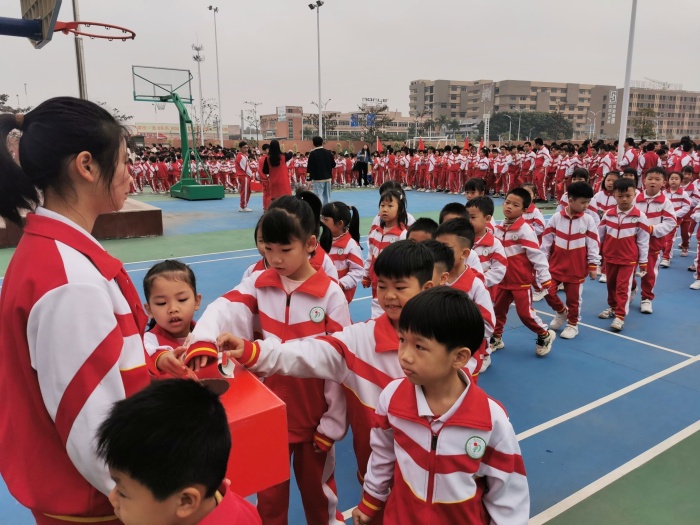 緊接著法治副校長吳志文進行講話,教育學生增強法律意識和安全意識,并要珍愛生命,遠離毒品。在喜慶的頒獎音樂中,學校為上學期取得優異成績的同學頒發獎狀獎品,并以此鼓勵學生借助榜樣的力量促進自身成長。隨后,學校開展慈善萬人行活動。學校領導們帶領老師們,老師們帶領同學們,一個接一個,井然有序地到捐款箱投下善款,盡顯大豐全體師生的愛心。