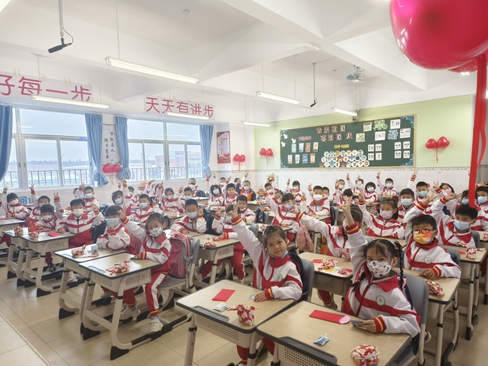春風拂面,盼你歸來。校門口,學校行政和老師們身穿紅色衣服或系紅色圍巾,排列于校門兩端,等待著孩子們的歸來。同學們著裝整齊,張張笑臉、聲聲問候,讓開學第一天的清晨充滿溫馨和甜蜜。值得一提的是,新學期校園里迎來了兩位特殊的朋友:學校卡通吉祥物——“進進”和“步步”,他們手拿“學得快樂,玩得聰明”揮春,擺動著萌萌的身體,熱情地跟每一位進校的同學問好。“進進”和“步步”體現了大豐“走好每一步,天天有進步”的辦學理念,“學得快樂,玩得聰明”則是總校智趣教育學風的要求。他們將會陪伴所有豐小學子一起健康成長,度過幸福童年。教室里,新學期、新希望、新夢想,為了激發學生的自豪感,營造溫馨的班級氛圍,促使學生在學校的大家庭里能愉快地學習和生活,老師們精心布置教室:多彩的板報彰顯了對孩子們真誠的歡迎,精美的禮物承載著老師們的殷殷祝福,五彩繽紛的氣球滿載著教育者的深情。別出心裁的入校和入班儀式,體現了學校對孩子們滿滿的祝福和期許。