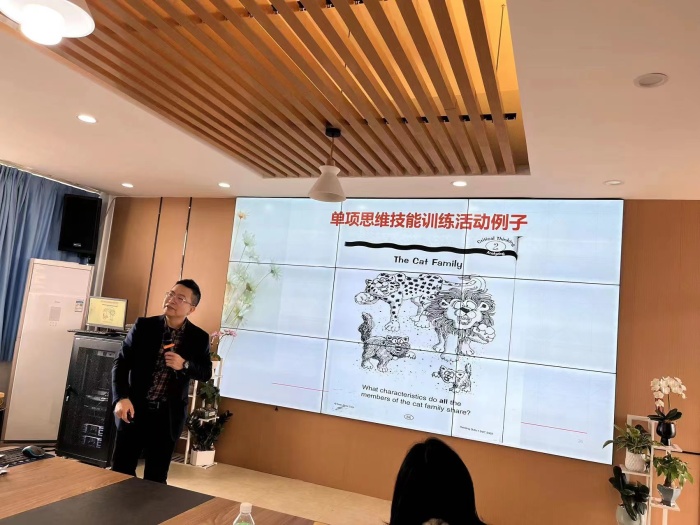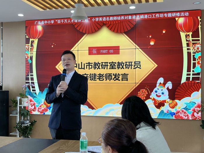 緊接著,與會領導嘉賓做表態性發言。廣東省外語藝術職業學院譚偉民教授肯定了工作坊開展的豐富多彩的研修活動以及取得的優異成績。在會上他作了題為《指向核心素養的英語課程教學改革路徑探索》的微講座,深入淺出地為港口工作坊成員的教學和研究指明了方向。中山市教育教學研究室小學英語教研員辛鍵老師祝賀港口工作坊取得豐碩的階段性成果,勉勵學員們要勤學善思,躬體力行,期待大家佳績頻傳。港口鎮教育和體育事務中心張育文主任作了最后總結發言,鼓勵大家面對不足,越戰越勇,為港口教育作出實在的成績。